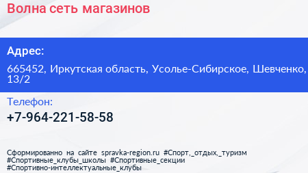 Волна, сеть магазинов по адресу 665452, Иркутская область, Усолье-Сибирское, Шевченко, 13/2 в дальнейшем Организация, размещена в следующих категориях: