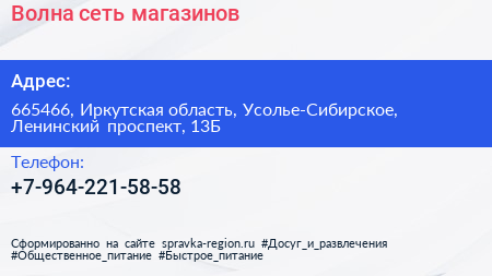 Волна, сеть магазинов по адресу 665466, Иркутская область, Усолье-Сибирское, Ленинский проспект, 13Б в дальнейшем Организация, размещена в следующих категориях: