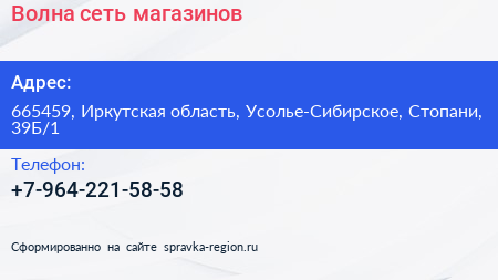 Волна, сеть магазинов по адресу 665459, Иркутская область, Усолье-Сибирское, Стопани, 39Б/1 в дальнейшем Организация, размещена в следующих категориях: