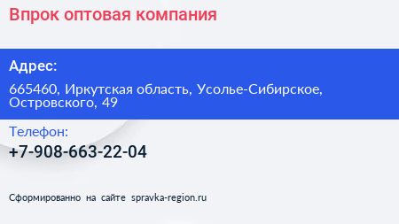Впрок, оптовая компания по адресу 665460, Иркутская область, Усолье-Сибирское, Островского, 49 в дальнейшем Организация, размещена в следующих категориях: