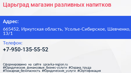Царьград, магазин разливных напитков по адресу 665452, Иркутская область, Усолье-Сибирское, Шевченко, 13/1 в дальнейшем Организация, размещена в следующих категориях: