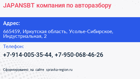 JAPANSBT, компания по авторазбору по адресу 665459, Иркутская область, Усолье-Сибирское, Индустриальная, 2 в дальнейшем Организация, размещена в следующих категориях: