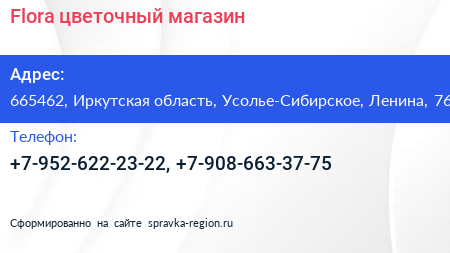 Flora, цветочный магазин по адресу 665462, Иркутская область, Усолье-Сибирское, Ленина, 76 в дальнейшем Организация, размещена в следующих категориях: