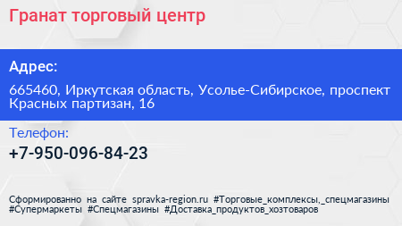 Гранат, торговый центр по адресу 665460, Иркутская область, Усолье-Сибирское, проспект Красных партизан, 16 в дальнейшем Организация, размещена в следующих категориях: