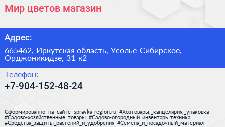 Мир цветов, магазин по адресу 665462, Иркутская область, Усолье-Сибирское, Орджоникидзе, 31 к2 в дальнейшем Организация, размещена в следующих категориях:
