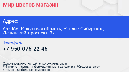 Мир цветов, магазин по адресу 665466, Иркутская область, Усолье-Сибирское, Ленинский проспект, 7а в дальнейшем Организация, размещена в следующих категориях: