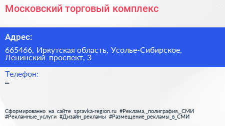 Московский, торговый комплекс по адресу 665466, Иркутская область, Усолье-Сибирское, Ленинский проспект, 3 в дальнейшем Организация, размещена в следующих категориях:
