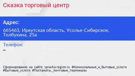 Сказка, торговый центр по адресу 665463, Иркутская область, Усолье-Сибирское, Толбухина, 25а в дальнейшем Организация, размещена в следующих категориях: