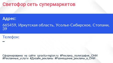 Светофор, сеть супермаркетов по адресу 665459, Иркутская область, Усолье-Сибирское, Стопани, 39 в дальнейшем Организация, размещена в следующих категориях: