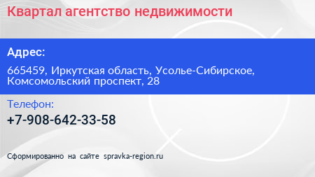 Квартал, агентство недвижимости по адресу 665459, Иркутская область, Усолье-Сибирское, Комсомольский проспект, 28 в дальнейшем Организация, размещена в следующих категориях:
