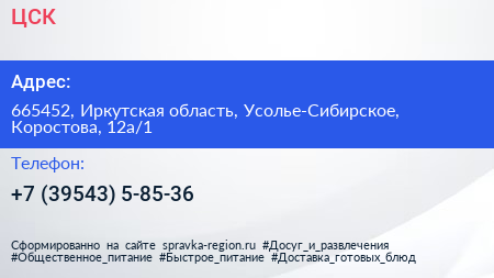 ЦСК по адресу 665452, Иркутская область, Усолье-Сибирское, Коростова, 12а/1 в дальнейшем Организация, размещена в следующих категориях: