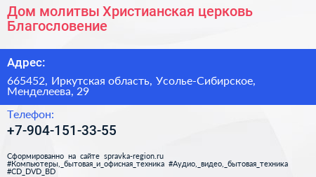 Дом молитвы, Христианская церковь Благословение по адресу 665452, Иркутская область, Усолье-Сибирское, Менделеева, 29 в дальнейшем Организация, размещена в следующих категориях: