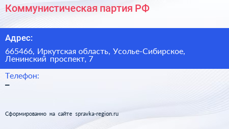 Коммунистическая партия РФ по адресу 665466, Иркутская область, Усолье-Сибирское, Ленинский проспект, 7 в дальнейшем Организация, размещена в следующих категориях: