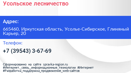 Усольское лесничество по адресу 665460, Иркутская область, Усолье-Сибирское, Глиняный Карьер, 20 в дальнейшем Организация, размещена в следующих категориях: