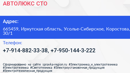 АВТОЛЮКС, СТО по адресу 665459, Иркутская область, Усолье-Сибирское, Коростова, 30/1 в дальнейшем Организация, размещена в следующих категориях: