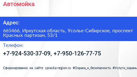 Автомойка по адресу 665466, Иркутская область, Усолье-Сибирское, проспект Красных партизан, 53/1 в дальнейшем Организация, размещена в следующих категориях: