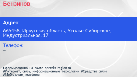 Бензинов по адресу 665458, Иркутская область, Усолье-Сибирское, Индустриальная, 17 в дальнейшем Организация, размещена в следующих категориях: