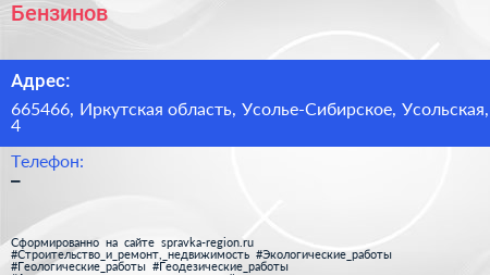 Бензинов по адресу 665466, Иркутская область, Усолье-Сибирское, Усольская, 4 в дальнейшем Организация, размещена в следующих категориях: