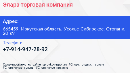 Элара, торговая компания по адресу 665459, Иркутская область, Усолье-Сибирское, Стопани, 20 к9 в дальнейшем Организация, размещена в следующих категориях: