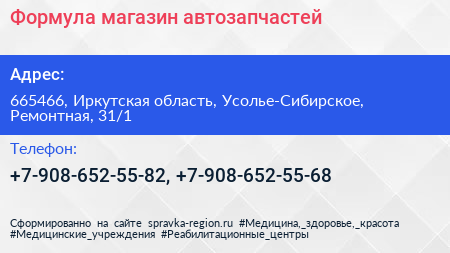 Формула, магазин автозапчастей по адресу 665466, Иркутская область, Усолье-Сибирское, Ремонтная, 31/1 в дальнейшем Организация, размещена в следующих категориях: