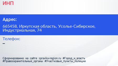 ИНП по адресу 665458, Иркутская область, Усолье-Сибирское, Индустриальная, 74 в дальнейшем Организация, размещена в следующих категориях: