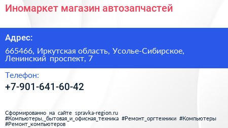 Иномаркет, магазин автозапчастей по адресу 665466, Иркутская область, Усолье-Сибирское, Ленинский проспект, 7 в дальнейшем Организация, размещена в следующих категориях: