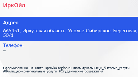 ИркОйл по адресу 665451, Иркутская область, Усолье-Сибирское, Береговая, 50/1 в дальнейшем Организация, размещена в следующих категориях: