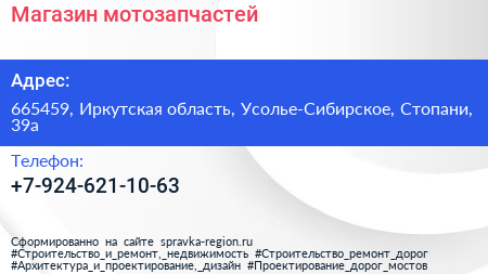 Магазин мотозапчастей по адресу 665459, Иркутская область, Усолье-Сибирское, Стопани, 39а в дальнейшем Организация, размещена в следующих категориях: