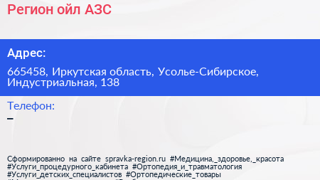 Регион ойл, АЗС по адресу 665458, Иркутская область, Усолье-Сибирское, Индустриальная, 138 в дальнейшем Организация, размещена в следующих категориях:
