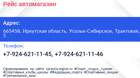 Рейс, автомагазин по адресу 665458, Иркутская область, Усолье-Сибирское, Трактовая, 5 в дальнейшем Организация, размещена в следующих категориях: