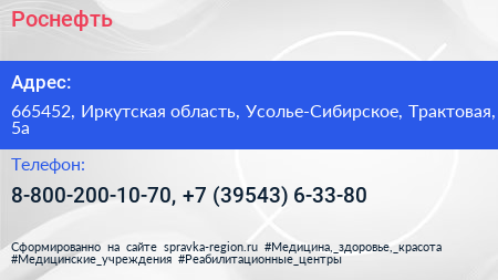 Роснефть по адресу 665452, Иркутская область, Усолье-Сибирское, Трактовая, 5а в дальнейшем Организация, размещена в следующих категориях: