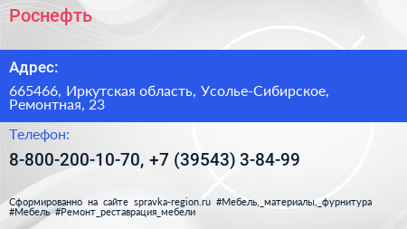 Роснефть по адресу 665466, Иркутская область, Усолье-Сибирское, Ремонтная, 23 в дальнейшем Организация, размещена в следующих категориях: