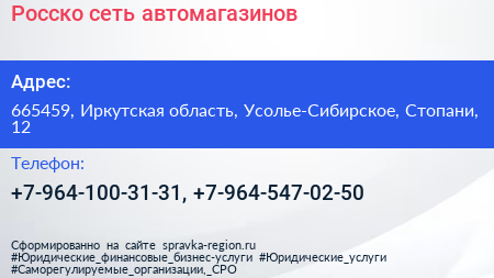 Росско, сеть автомагазинов по адресу 665459, Иркутская область, Усолье-Сибирское, Стопани, 12 в дальнейшем Организация, размещена в следующих категориях:
