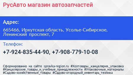 РусАвто, магазин автозапчастей по адресу 665466, Иркутская область, Усолье-Сибирское, Ленинский проспект, 7 в дальнейшем Организация, размещена в следующих категориях: