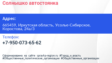 Солнышко, автостоянка по адресу 665459, Иркутская область, Усолье-Сибирское, Коростова, 24а/3 в дальнейшем Организация, размещена в следующих категориях: