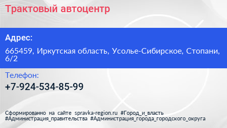 Трактовый, автоцентр по адресу 665459, Иркутская область, Усолье-Сибирское, Стопани, 6/2 в дальнейшем Организация, размещена в следующих категориях: