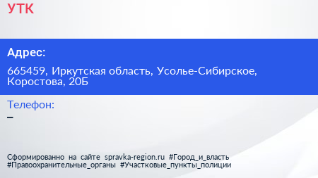 УТК по адресу 665459, Иркутская область, Усолье-Сибирское, Коростова, 20Б в дальнейшем Организация, размещена в следующих категориях: