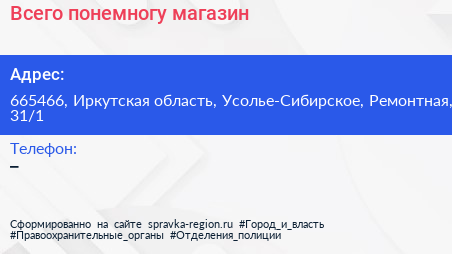 Всего понемногу, магазин по адресу 665466, Иркутская область, Усолье-Сибирское, Ремонтная, 31/1 в дальнейшем Организация, размещена в следующих категориях: