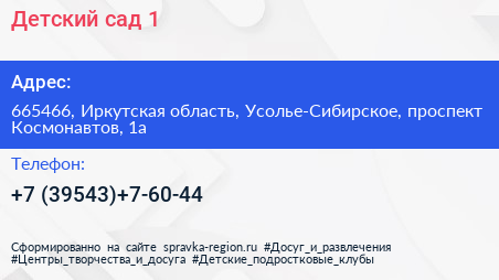 Детский сад №1 по адресу 665466, Иркутская область, Усолье-Сибирское, проспект Космонавтов, 1а в дальнейшем Организация, размещена в следующих категориях: