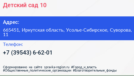 Детский сад №10 по адресу 665451, Иркутская область, Усолье-Сибирское, Суворова, 11 в дальнейшем Организация, размещена в следующих категориях: