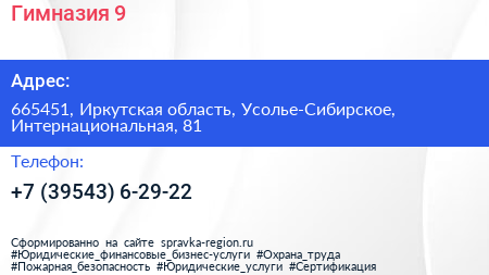 Гимназия №9 по адресу 665451, Иркутская область, Усолье-Сибирское, Интернациональная, 81 в дальнейшем Организация, размещена в следующих категориях: