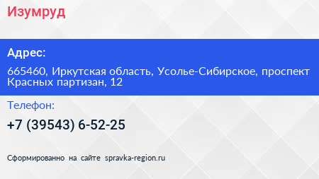 Изумруд по адресу 665460, Иркутская область, Усолье-Сибирское, проспект Красных партизан, 12 в дальнейшем Организация, размещена в следующих категориях: