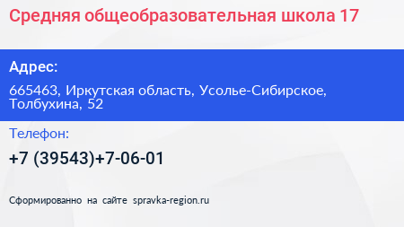 Средняя общеобразовательная школа №17 по адресу 665463, Иркутская область, Усолье-Сибирское, Толбухина, 52 в дальнейшем Организация, размещена в следующих категориях: