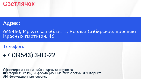 Светлячок по адресу 665460, Иркутская область, Усолье-Сибирское, проспект Красных партизан, 46 в дальнейшем Организация, размещена в следующих категориях: