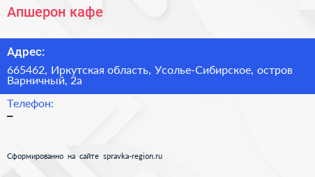 Апшерон, кафе по адресу 665462, Иркутская область, Усолье-Сибирское, остров Варничный, 2а в дальнейшем Организация, размещена в следующих категориях: