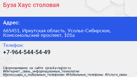 Буза Хаус, столовая по адресу 665451, Иркутская область, Усолье-Сибирское, Комсомольский проспект, 101а в дальнейшем Организация, размещена в следующих категориях: