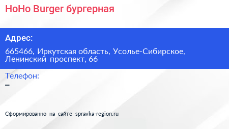 HoHo Burger, бургерная по адресу 665466, Иркутская область, Усолье-Сибирское, Ленинский проспект, 66 в дальнейшем Организация, размещена в следующих категориях: