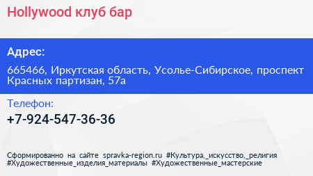 Hollywood, клуб-бар по адресу 665466, Иркутская область, Усолье-Сибирское, проспект Красных партизан, 57а в дальнейшем Организация, размещена в следующих категориях: