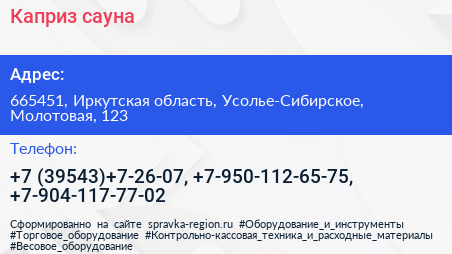 Каприз, сауна по адресу 665451, Иркутская область, Усолье-Сибирское, Молотовая, 123 в дальнейшем Организация, размещена в следующих категориях: