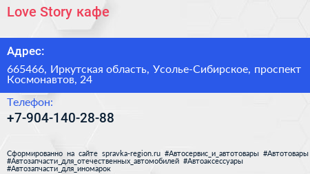 Love Story, кафе по адресу 665466, Иркутская область, Усолье-Сибирское, проспект Космонавтов, 24 в дальнейшем Организация, размещена в следующих категориях: